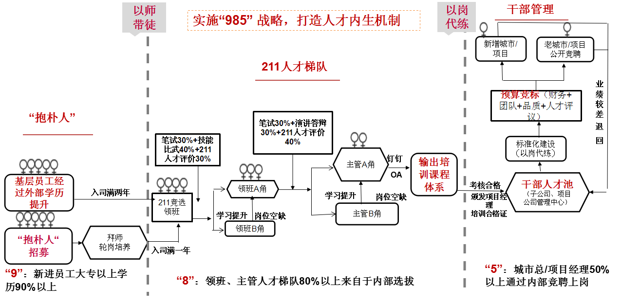 内生机制:以关键人才获取,梯队建设为核心,打造持续的人才供应链。 实施“985” 战略,打造人才内生机制:通过以师带徒、技能比武、预算竞标等方式实现人才内生机制。
