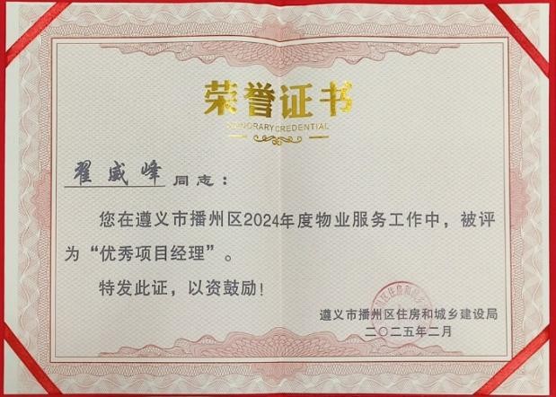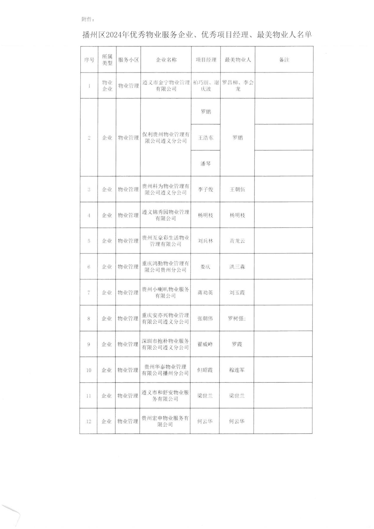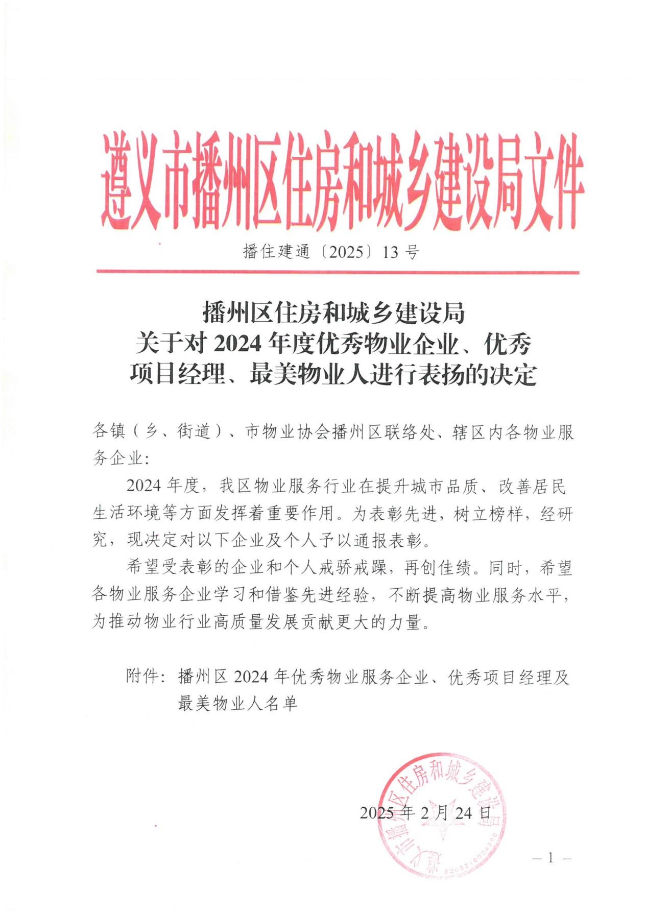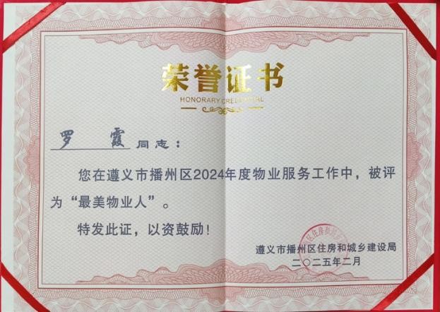 2025年2月24日 遵义市播州区住房和城乡建设局最新发布《关于对2024年度优秀物业企业、优秀项目经理、最美物业人进行表扬的决定》(播住建通〔2025〕13号),授予抱朴物业遵义分公司“优秀企业”称号,分公司负责人翟威峰获评“优秀项目经理”,员工罗霞当选“最美物业人”。这是遵义分公司继2023年后,连续两年蝉联该区行业最高荣誉,彰显团队在物业服务领域的标杆地位。此次评选中,《优秀企业》奖项的获得,充分肯定了公司在物业管理标准化建设、智慧化升级及社区文化建设中的创新实践。